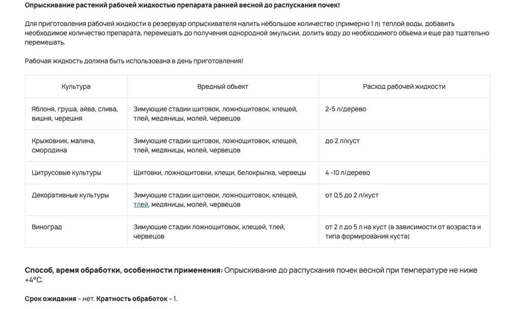 Подходит для деревьев и кустарников, позволяет уничтожать насекомых до выхода из спячки.