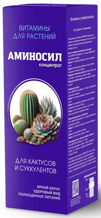 Регулярное использование Аминосил обеспечит адаптированное эффективное питание вашей коллекции кактусов и суккулентов, включая алоэ, агавы, гастерии, каланхоэ, молочай, монантесу, толстянки, шлюмбергеры и пр. Легкое усвоение витаминов и формирование крепкого иммунитета сделает растения устойчивыми к болезням, вредителям и неблагоприятным условиям среды. Усилит цветение и подарит цветам яркую окраску. • Эффективно насыщает растения всеми необходимыми элементами питания • Способствует нарастанию зеленой массы и яркому цветению • Уменьшает риск заболеваний и увеличивает скорость восстановления растений • Укрепляет корневую систему и защищает ее от загнивания Инструкция: Расход 5мл Аминосил разбавить в 1 л воды. Поливать почву получившимся раствором до полного намокания грунта/субстрата. Не допускается опрыскивание или полив растения сверху! Периодичность: 1 раз в 2 недели с марта по октябрь, 1 раз в 4 недели с ноября по февраль.