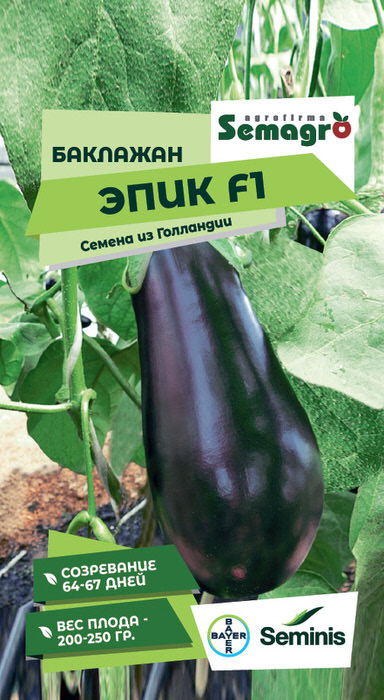 Ранний (62-64дней), высокоурожайный гибрид. Растение сильное, мощное. Плоды однородные, овальной, каплевидной формы, размером 21х10см, массой 220-250г, кожица пурпурно-черного цвета, мякоть белая, превосходного качества