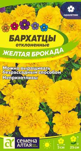 Декоративный однолетник высотой 20-25 см. Кустики компактные густооблиственные. Соцветия-корзинки идеальной формы гвоздиковидные ярко-желтые. Диаметр корзинок 4-5 см, в центре небольшой хохолок из трубчатых цветков. Послужит отличным украшением парадных цветников, клумб, балконов, можно выращивать среди огородных растений для отпугивания вредителей. Неприхотливое, засухоустойчивое и светолюбивое растение, выносит небольшое затенение. Заморозков не переносит. Наибольшей декоративности достигает на открытых солнечных участках с питательными нейтральными суглинистыми почвами.