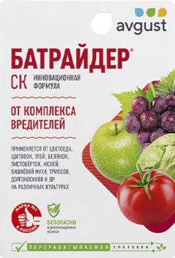 Батрайдер губителен и для взрослых особей, и для личинок разных возрастов. Благодаря высокой скорости воздействия он, вызывает паралич у насекомых уже в течение первого часа. Препарат обладает кишечным, контактным и системным свойствами, поэтому у вредителей нет шансов – они гибнут как при попадании раствора на них, так и при питании соками обработанного растения. Полное уничтожение всей колонии достигается за 24 часа. Важно, что в плодах и овощах Батрайдер не накапливается и экономичен в применении.