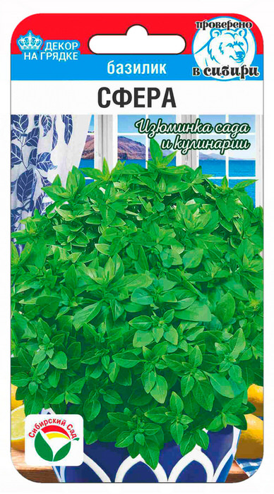 Растение компактное, обильно облиственное высотой 15-20см, хорошо сохраняет форму шара, очень декоративно. Листва ярко-зелёная, цветение обильное - вторая половина лета. В кулинарии используют цветы и листья растения, в свежем и сушеном виде. Веточка базилика придаст изысканные вкус зимним консервациям, домашним морсам и компотам. Для украшения блюд применяют срезанные стебли с листьями и цветами.
