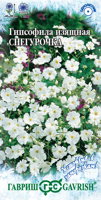 Высотой 40-50 см, образующими ажурный кустик. Цветет очень обильно в июне-июле, около трех недель. Для получения цветущих растений в течение всего лета посев можно проводить в несколько сроков с интервалом 1,5-2 недели (гипсофила зацветает через 1,5 месяца после посева). Снежно-белые цветки диаметром до 1 см собраны в рыхлые широкие соцветия. Холодостойка, светолюбива и достаточно засухоустойчива, предпочитает легкие некислые почвы. Выращивают прямым посевом в грунт в начале мая или под зиму. Всходы появляются через 8-10 дней после посева, их прореживают с расстоянием между растениями 15 см. Используется для посадки в миксбордерах, альпинариях, бордюрах и рабатках и получения срезки (для аранжировки букетов).