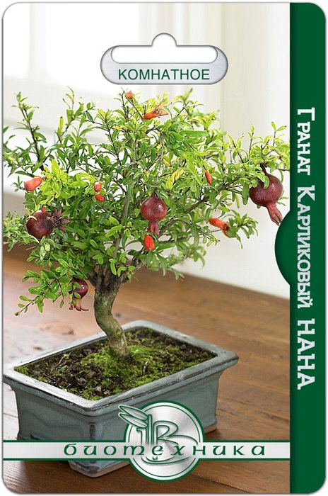 Представляет собой, как бы «уменьшенную копию» садового граната, с мелкими листьями, цветками и плодами.