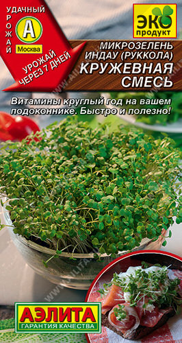 В состав смеси входит индау (руккола) ИЗУМРУДНЫЕ УЗОРЫ ® – 50% и индау (руккола) ХУДЕЙ ВКУСНО ® – 50%. Микрозелень индау (руккола) ценится за богатое содержание в ней витаминов и минералов. Молодые побеги рукколы – это природный источник йода и витамина С. Благодаря аромату и легкому ореховому вкусу, зелень очень популярна в кулинарии. Например, в качестве