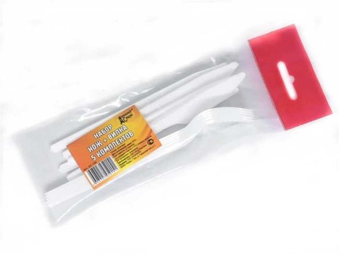 Основные преимущества одноразовой посуды – это компактность, легкий вес и быстрая утилизация. Такими приборами можно есть как холодные закуски, так и горячие блюда. В одном наборе – 5 комплектов вилок и ножей.