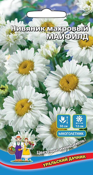 Крупные, махровые соцветия-корзинки, диаметром до 12 см. Соцветия с двойным рядом белоснежных лепестков и жёлтым центром. Стебли прямые, прочные, высотой до 90 см. Цветение обильное, продолжительное – с середины лета до заморозков. Великолепно смотрится в одиночных и групповых посадках на газоне, на фоне декоративных кустарников, в миксбордерах. Сорт дает отличный материал для срезки, соцветия стоят в воде 9-10 дней.