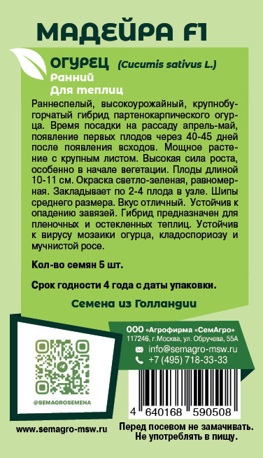 Гибрид раннеспелый, партенокарпический, салатный, растение индетерминантное, средневетвистое, преимущественно женского типа цветения. Число женских цветков в узле преимущественно два или три. Зеленец средней длины, цилиндрический, зеленый, бугорки среднего размера, с белыми шипами. Масса зеленца 81-85 г. Вкус отличный. Урожайность в пленочных теплицах составила 12,8 кг/кв.м