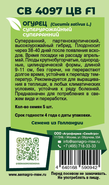 Суперранний (38-40 дней), высокоурожайный гибрид. Плоды крупнобугорчатые, однородной цилиндрической формы, длиной 9-11 см, без горечи, не перерастают долгое время, устойчив к перепаду температур. Рекомендуется для выращивания в теплицах, в любых климатических условиях, устойчив к ряду болезней. Предназначен для потребления в свежем виде и переработки.