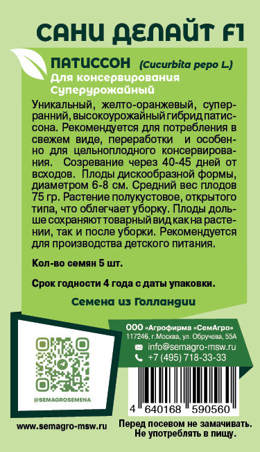 Очень ранний (созревание через 40-45 дней) гибрид. Плоды дискообразной формы, диаметром 6-8см., средний вес плодов 75гр. Универсальное использование.
