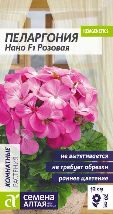 Очаровательное низкорослое растение, в период цветения формирующее множество цветоносов, покрытых ярко розовыми цветками, собранными в шаровидные соцветия диаметром до 7 см. Розетки листьев очень плотные, темно-зеленые. Растение не вытягивается, не требует применения регуляторов роста. Посадки образуют сплошной цветущий ковер. Широко используется в озеленении лоджий, веранд, балконов, для создания композиций в саду, а также в качестве почвопокровного растения. Одно из самых неприхотливых растений, уход за которым не требует значительных усилий. Пеларгония светолюбива, легко переносит недостаток влаги. Предпочитает влагоёмкую рыхлую питательную почву с чуть кислой или нейтральной реакцией.