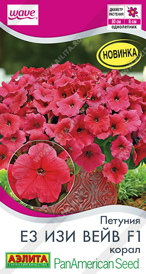 Инновационная эксклюзивная серия американской селекции «Е3 Изи вейв F1». Растение образует очень густой полураскидистый куст ? 60-80 см (при высоте 15- 30 см). Благодаря целенаправленной селекционной работе цветение гибридов наступает уже при длине дня 9,5 часов и длится до устойчивых осенних заморозков, что значительно сокращает общие затраты при благоустройстве. Насыщенная цветовая гамма крупных цветков (? 6-8 см), необычная полуампельная форма, однородность и выносливость этих растений оставляют позади всех конкурентов. Серия одинаково роскошно выглядит в вазонах и подвесных кашпо, в виде ковровых посадок в цветниках.