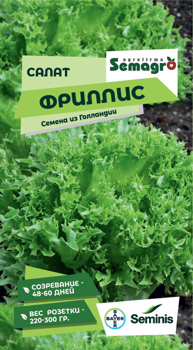 Листовой сорт салата с гофрированным хрустящим листом . Листовая розетка средне-крупная, открытая , насыщенного ярко-зеленого цвета Созревание от 48 до 80 дней в зависимости от климатических условий. Рекомендуется для выращивания в открытом грунте с ранней весны до поздней осени , а также в теплицах с октября по март.