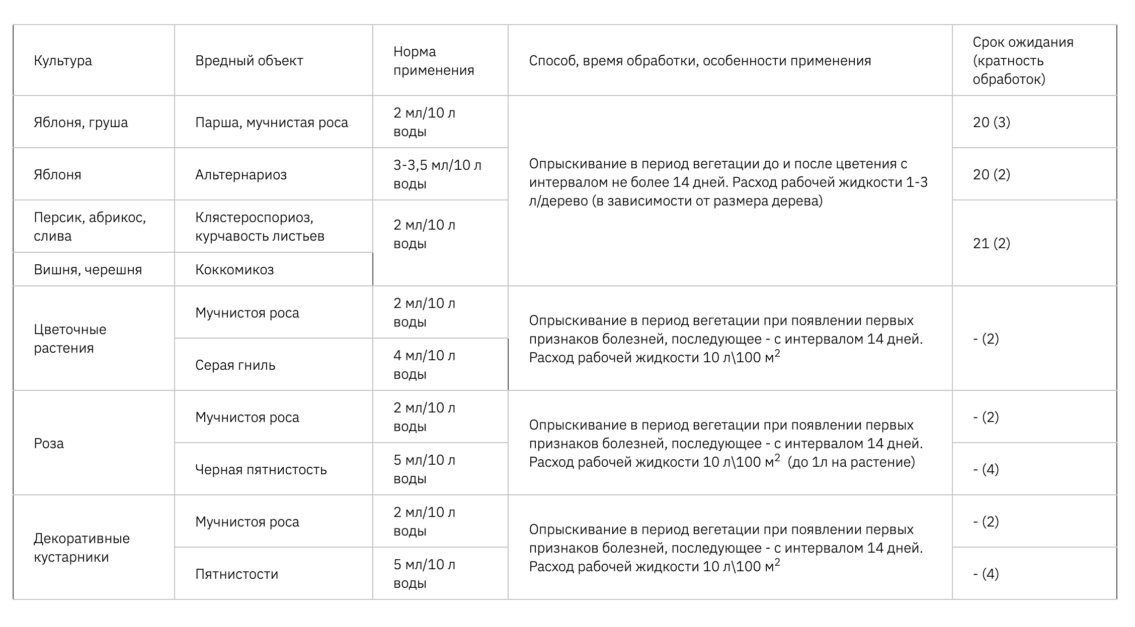 Системный фунгицид для защиты плодовых культур от комплекса болезней; цветочных растений и декоративных кустарников – от мучнистой росы, серой гнили; роз – от черной пятнистости.