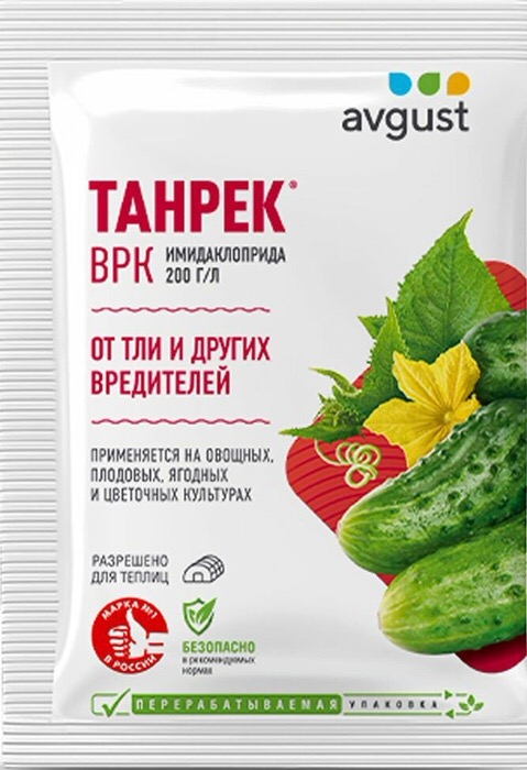 Огурцы и помидоры в теплице: Инсектицидный рабочий раствор «Танрек» готовится аналогичным образом, как и для картофеля. Расход готового состава: 1–3 литра на 10 квадратных метров.