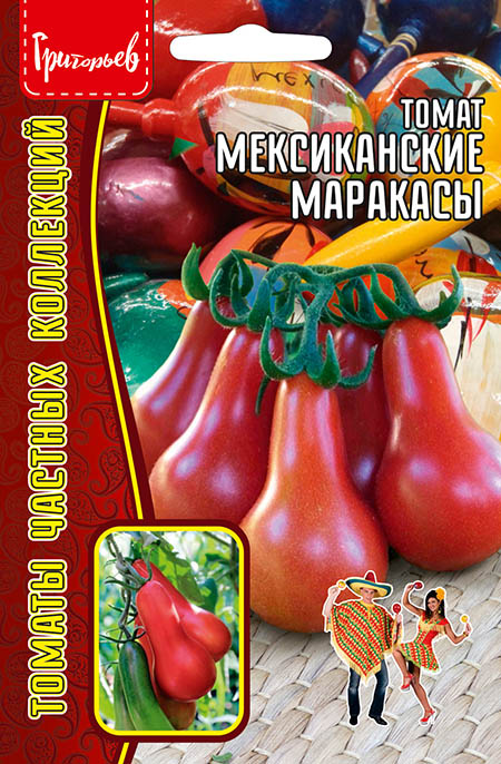 Томат с необычной оригинальной формой плодов похожей на маракасы. Индетерминантный (высотой 1,2-1,3 м, в теплице до 1,8 м), урожайный, среднеспелый (95-110 дней) сорт. Отлично плодоносит как в теплице, так и в открытом грунте. Томаты мясистые, с малым количеством семян, массой 120-150 г. Плоды вкусные как в свежем виде, так и во всех видах консервации, прекрасно подходят для сушки и вяления.