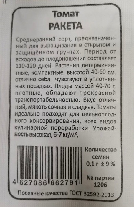 Среднеранний сорт, от всходов до плодоношения 110-120 дней. Пригоден для загущенной посадки. Растения детерминантные, компактные, высотой 40-60 см. Плоды удлиненно-сливовидные, красные, массой 100-120 г, сочные и вкусные. Для салатов и цельноплодного консервирования. Урожайность – 6-7 кг/м2.