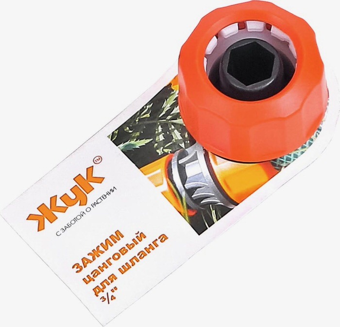 Шланг надевается на внутренний штуцер, при затягивании внешней гайки "лепестки"цанги смыкаются, и шланг диаметром 3/4 надёжно фиксируется.