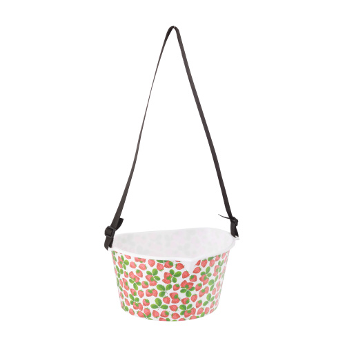 Ёмкость имеет полукруглую форму и ремень, для подвешивания на шею.На стенках изделия расположена аппликация в виде лесных ягод.